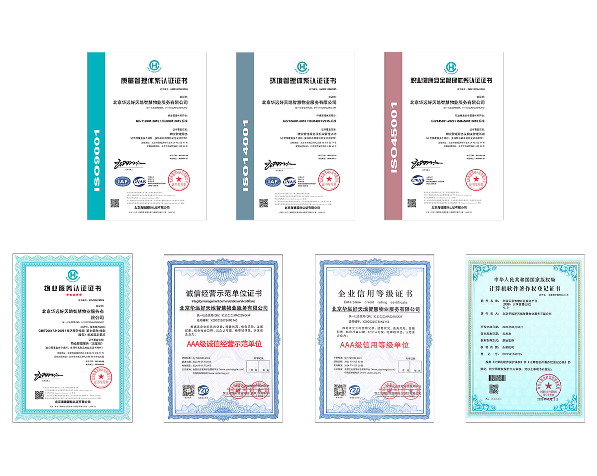 华远好天地智慧物业服务已通过GB/T19001-2016/ISO9001:2015质量管理体系、GB/T24001-2016/ISO14001:2015环境管理体系、GB/T45001-2020/ISO45001:2018职业健康安全管理体系、AAA级诚信经营示范单位、AAA级信用等级单位和五星级物业管理服务认证。公司自有物业管理平台“华远云享智慧社区服务平台”已取得计算机软件著作权。