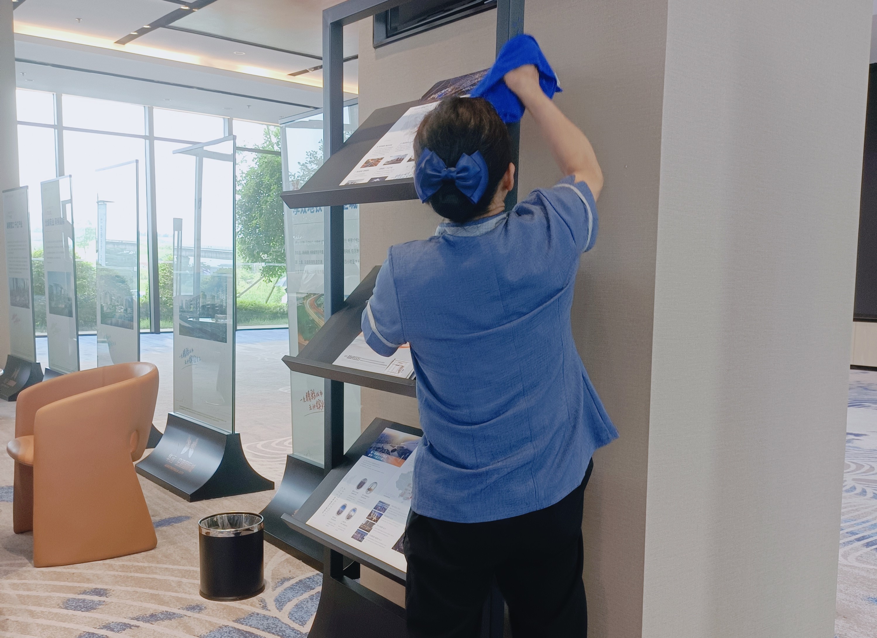 营销中心是展示企业形象的窗口单位,是项目推介的重要场所,人员流动性较大,所以环境卫生、防疫消杀工作是重中之重,除了大厅地面与来往通道这些日常地方,更加要注意一些隐蔽不易消杀的地方,如:各种角落,幕布背后等等。
