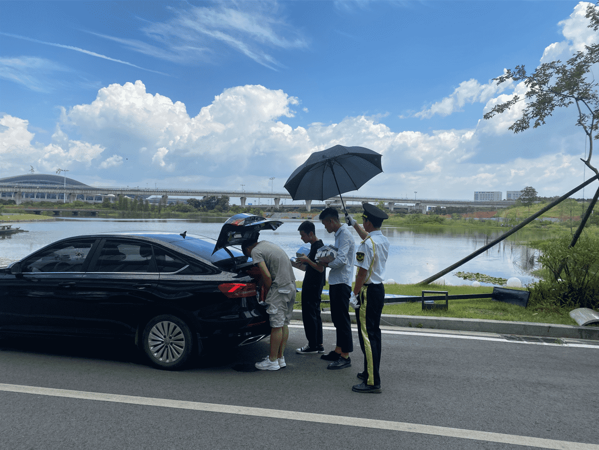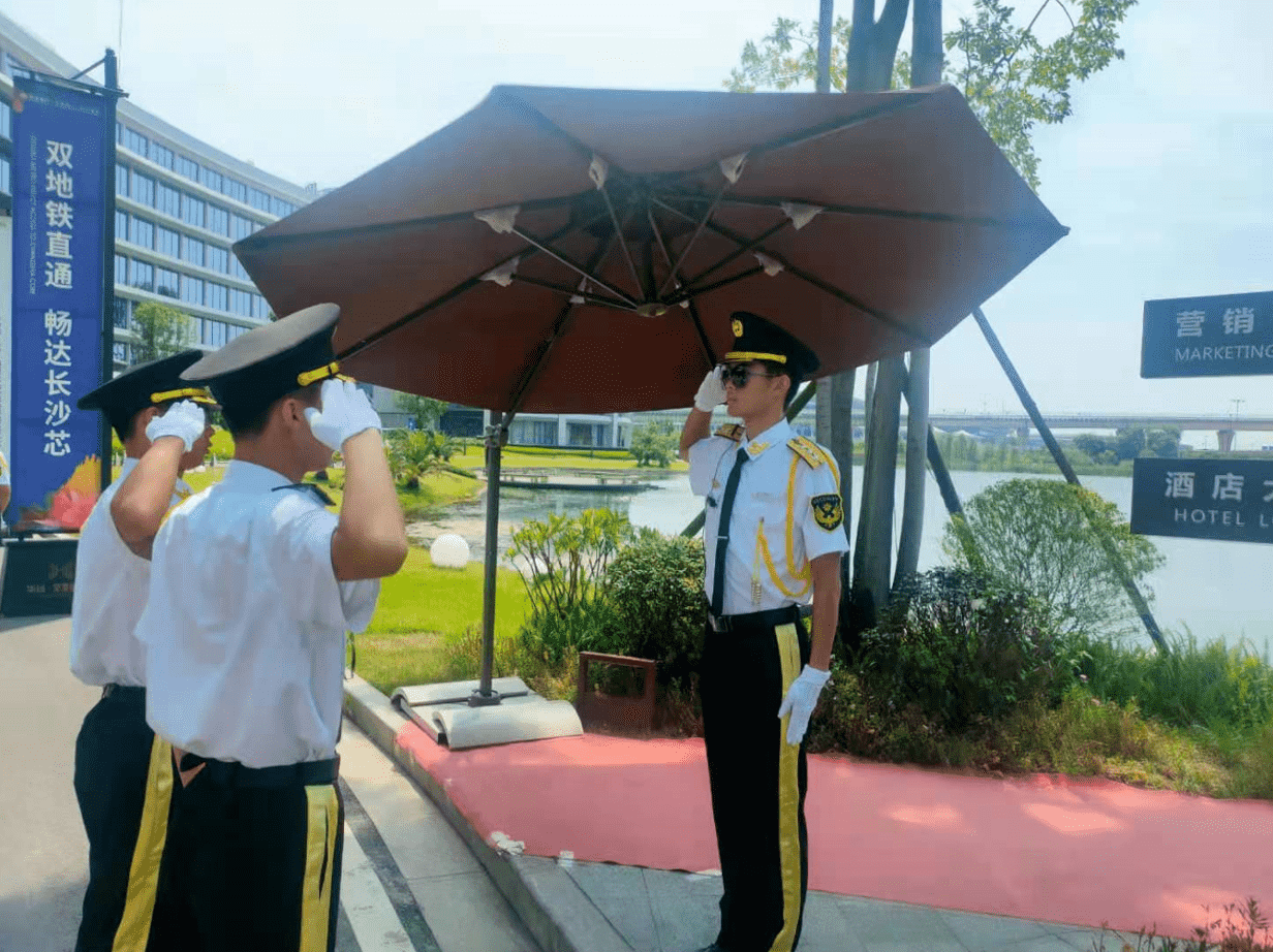 从第一缕晨光入怀到夕阳落入地平线,标准化的迎宾服务贯穿着秩序维护人员工作的始终,他们以一身整洁的制服、一副挺拔的身姿,传递着初见的问候,向所有来往人员行礼致敬,以专业的手势贴心指引车辆停放,协助客户打开车门,下车后为客户撑开睛雨伞,一路护送客户至营销中心,烈日下留下他们穿梭忙碌的身影。