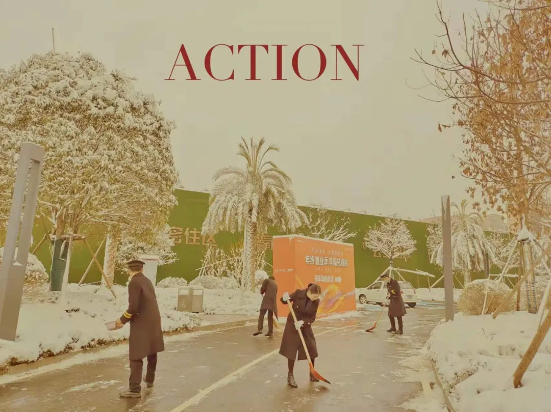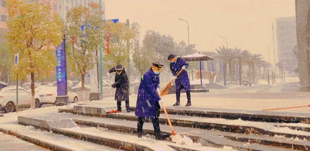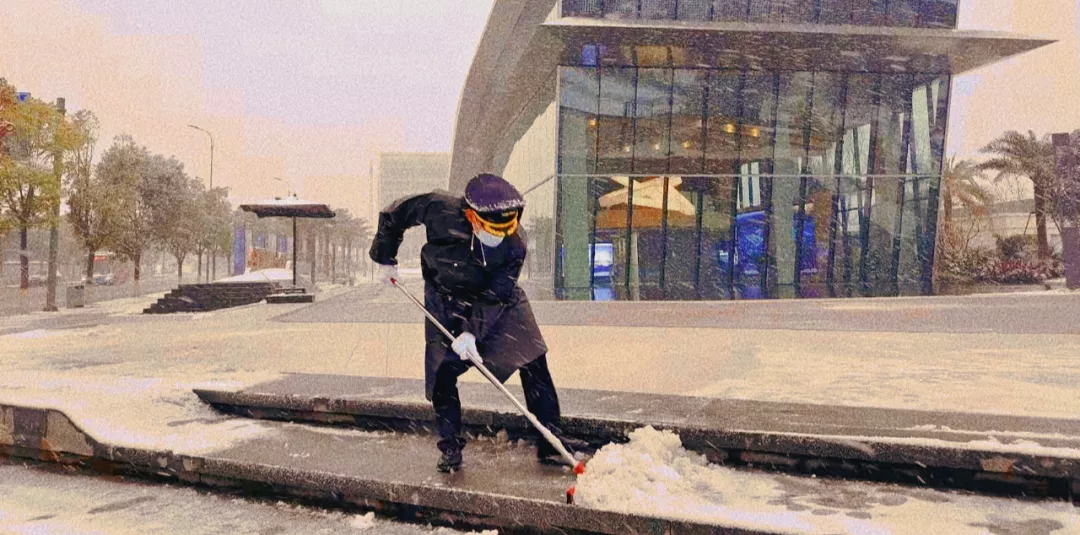 大家齐心协力挥舞着铁锹、扫把,在皑皑白雪中成为一道亮丽的风景线。这场迟到的初雪似乎有了“灵气”一般,鼓足了力气一直不停,扫过后的路面又很快覆盖一层洁白的积雪。可大家并没有懈怠,一遍又一遍的扫清积雪,以最快的速度为售楼处开辟出安全通道。